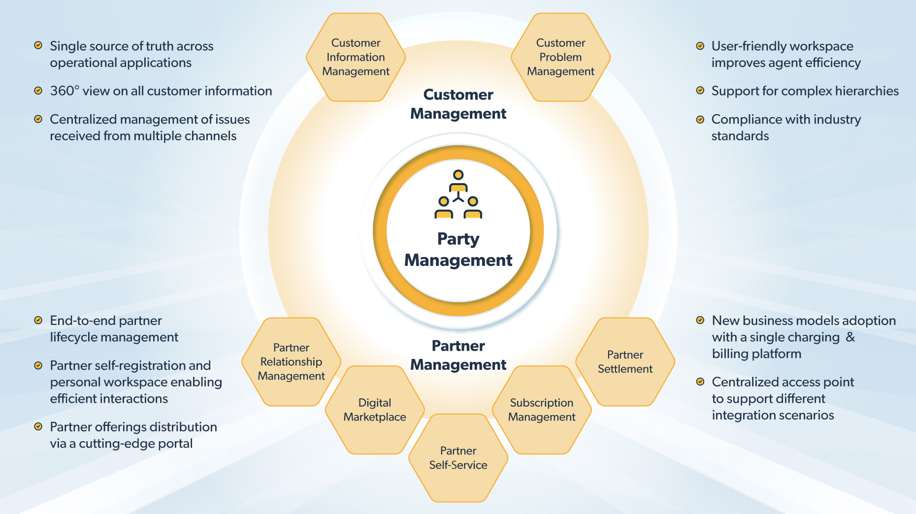 Party Management, incorporating Customer Management and Partner Management, consolidates data into a unified source of truth, offering a superior experience with real-time data synchronization and full visibility over relationships. It ensures consistent and accurate information across all operational applications, supporting end-to-end lifecycle management for both customers and partners—from onboarding to ongoing support.