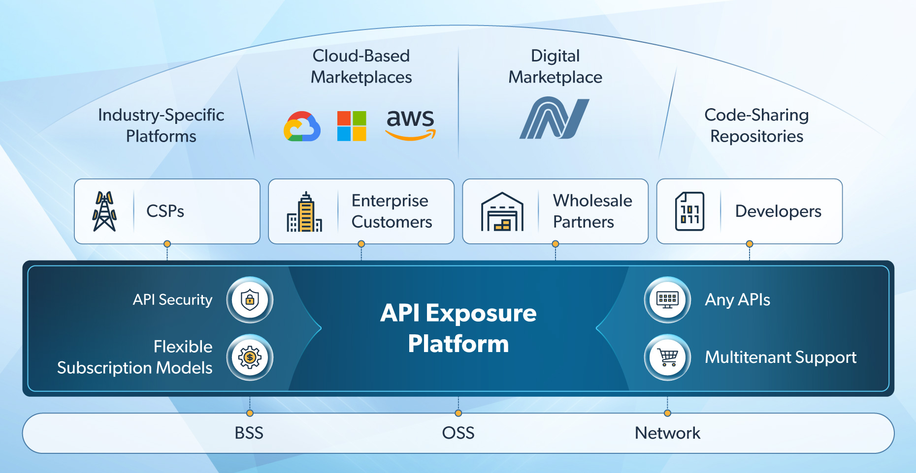 API Exposure Platform: Provides a single frontend for CSPs, partners and developers where stakeholders can discover, subscribe to and interact with APIs, fostering collaboration and ecosystem development.