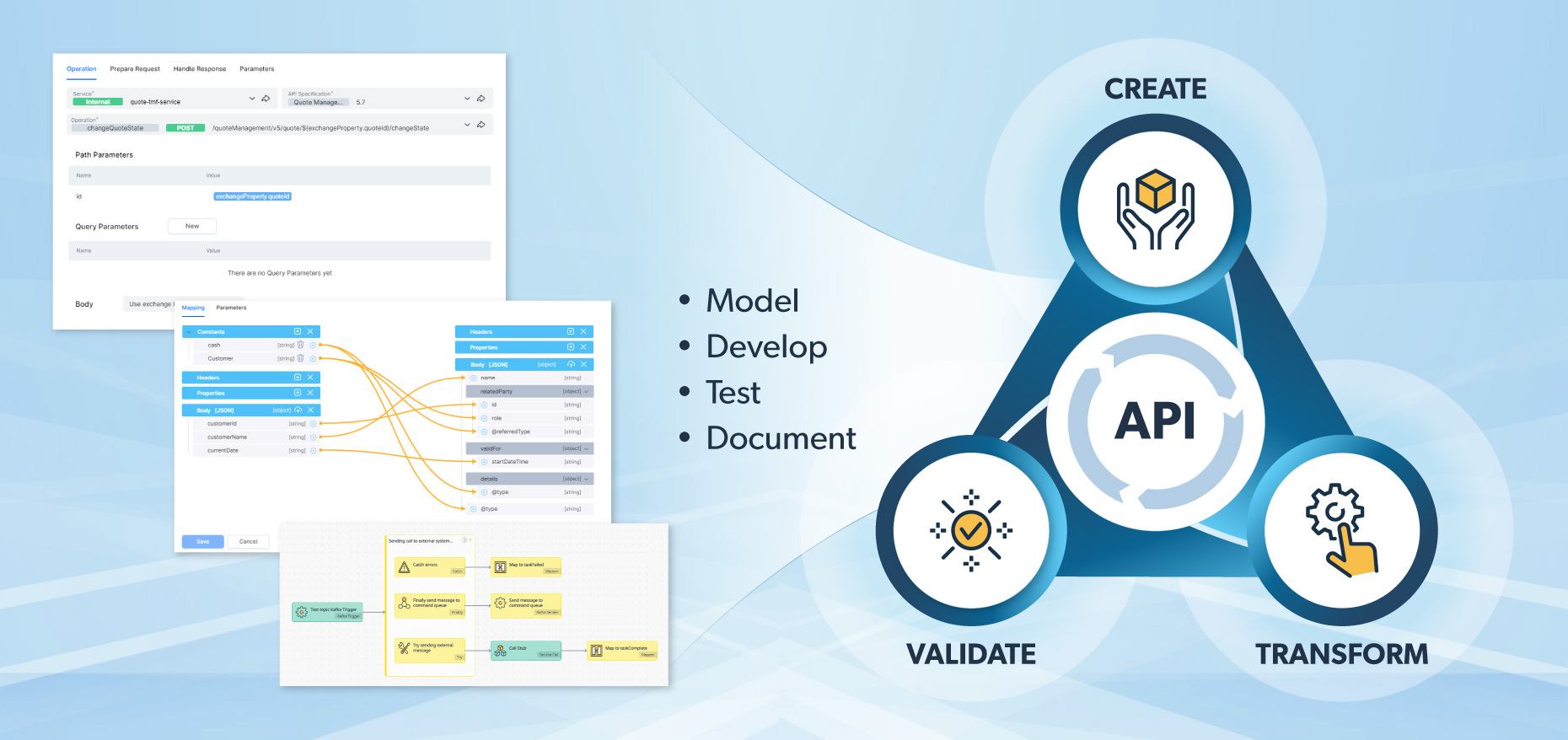 Users can test APIs, transform payloads and ensure consistency with enforced style guides and standards compliancy. The intuitive drag-and-drop interface, incorporating templates and a GenAI assistant, provides design recommendations and automatically adapts APIs based on changing requirements. This helps to enhance API reusability and accelerate integration design.