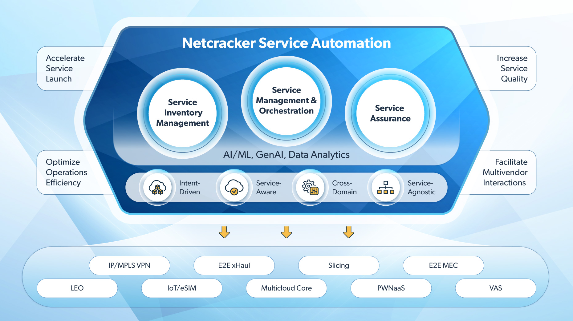 By offering a real-time, consolidated view across all network and cloud domains, Netcracker automates every aspect of cross-domain and domain-specific services—from design and deployment to lifecycle management, optimization and assurance—through a single pane of glass. The solution leverages YANG-based service models, low-code design tools and AI-driven intent-based automation for seamless orchestration, real-time monitoring and lifecycle management.