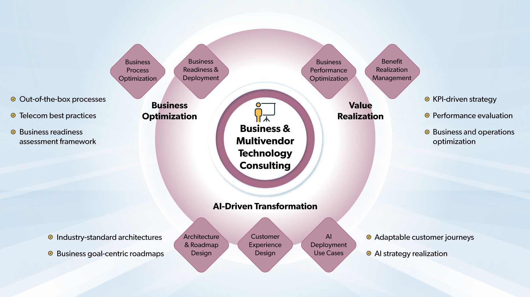 AI-Driven Transformation. Assists operators to define a cohesive strategy for digital transformation, designing solution architecture and implementation roadmaps and delivering optimal customer journeys.