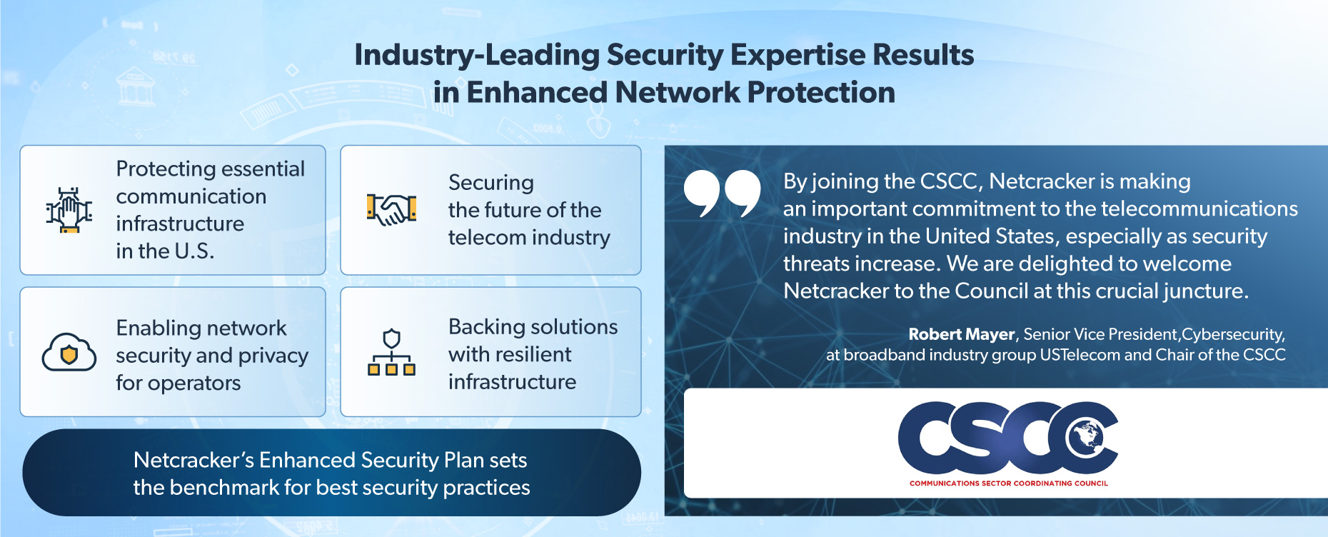 As a member of the Communications Sector Coordinating Council (CSCC), Netcracker actively collaborates with U.S. federal agencies and related organizations to protect the nation’s critical communications infrastructure. The CSCC serves as the principal industry interface to the Department of Homeland Security (DHS), Cybersecurity & Infrastructure Security Agency (CISA) and the Federal Communications Commission (FCC) under the National Infrastructure Protection Plan (NIPP). Netcracker’s involvement reflects a deep commitment to the security, reliability and resilience of U.S. communication networks and ensures that customers benefit from real-time threat awareness and protection of critical national infrastructure.