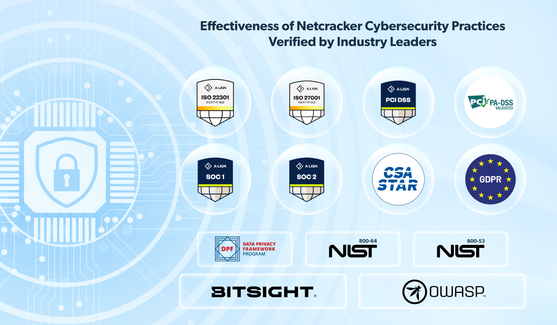 Netcracker aligns its security practices with the highest industry standards. This includes: