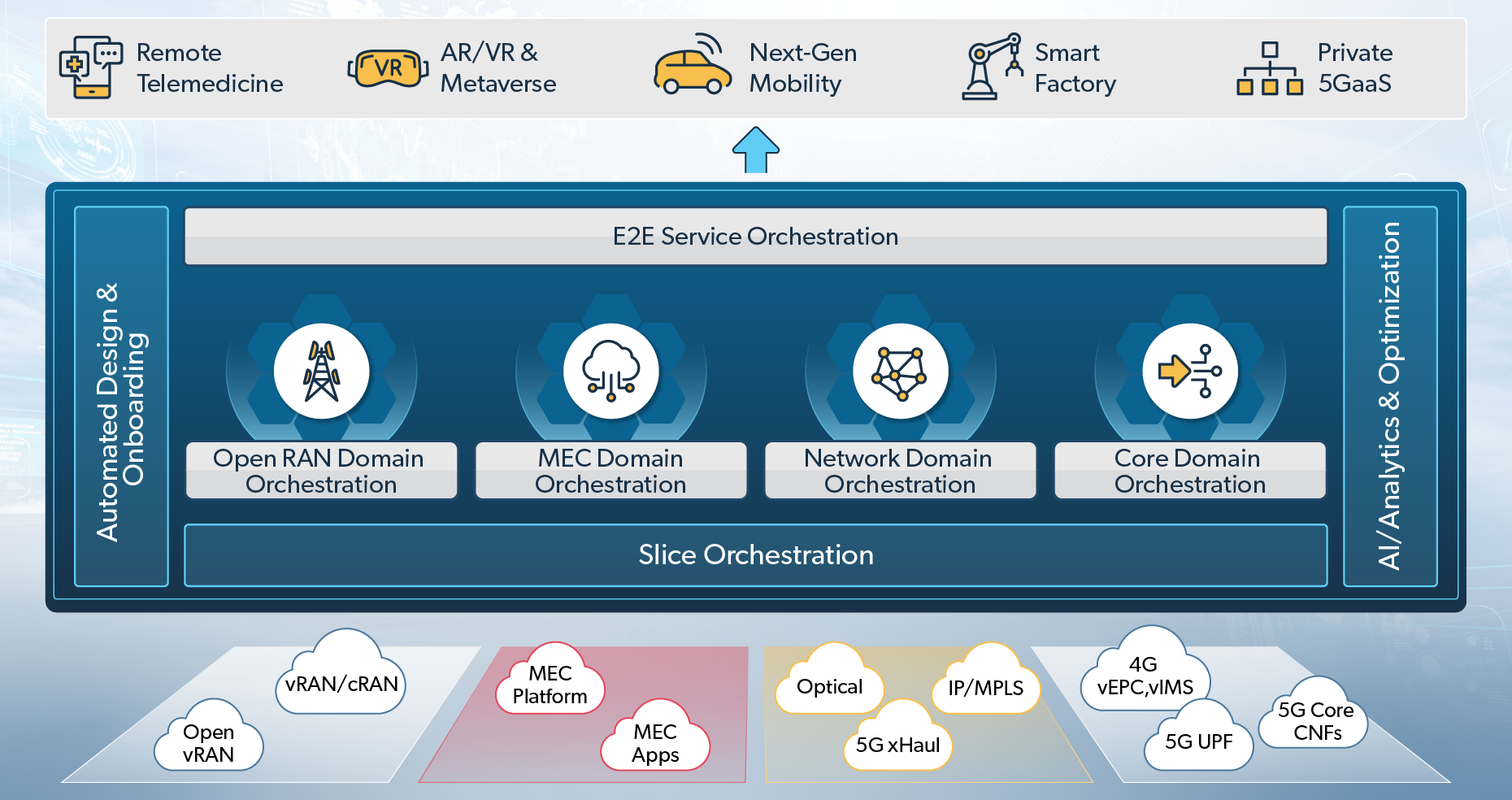 Automates the full lifecycle of network slices within and across domains, including design, rapid slice creation, real-time delivery, assurance and optimization, to meet strict SLAs.