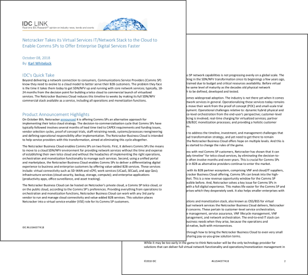 Netcracker Business Cloud has a broad range of service packages that are ready to go, leveraging an extensive set of pre-integrated VNF and cloud partners from our award-winning Ecosystem 2.0 program. By bundling cloud connectivity services, such as SD-WAN, with value-added network services, enterprise applications and IoT infrastructure applications, service providers can create and launch highly differentiated enterprise and vertical-specific offerings. New services and partner software are continuously added to Netcracker Business Cloud based on the service provider’s specific market needs.