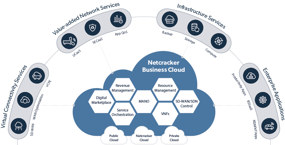 Netcracker Business Cloud eliminates the time, cost and complexity barriers that service providers face towards cloud transformation by running the industry’s first full-stack SDN/NFV solution, from VNFs to orchestration to BSS to OSS to portals and a digital marketplace, as a service. Using Netcracker’s cloud, or a multi-cloud environment together with service provider’s own cloud and public cloud, we take full end-to-end responsibility for the entire suite of services.