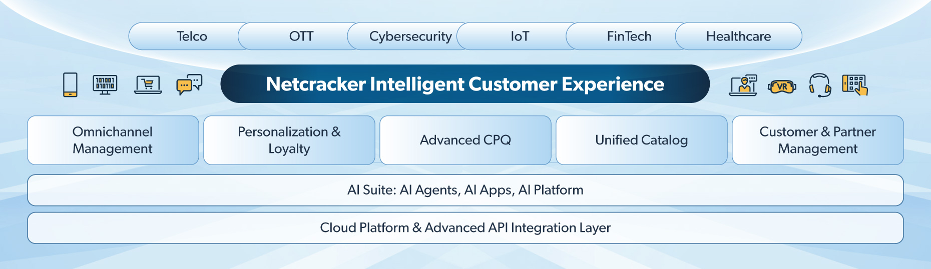 API Management and Integration connects external domains—spanning Fixed, Mobile, B2B, Fintech, Healthcare and other verticals—into one continuous, actionable data flow. Designed with privacy and compliance at its core, Netcracker Intelligent CX ensures secure data handling in accordance with industry regulations.
