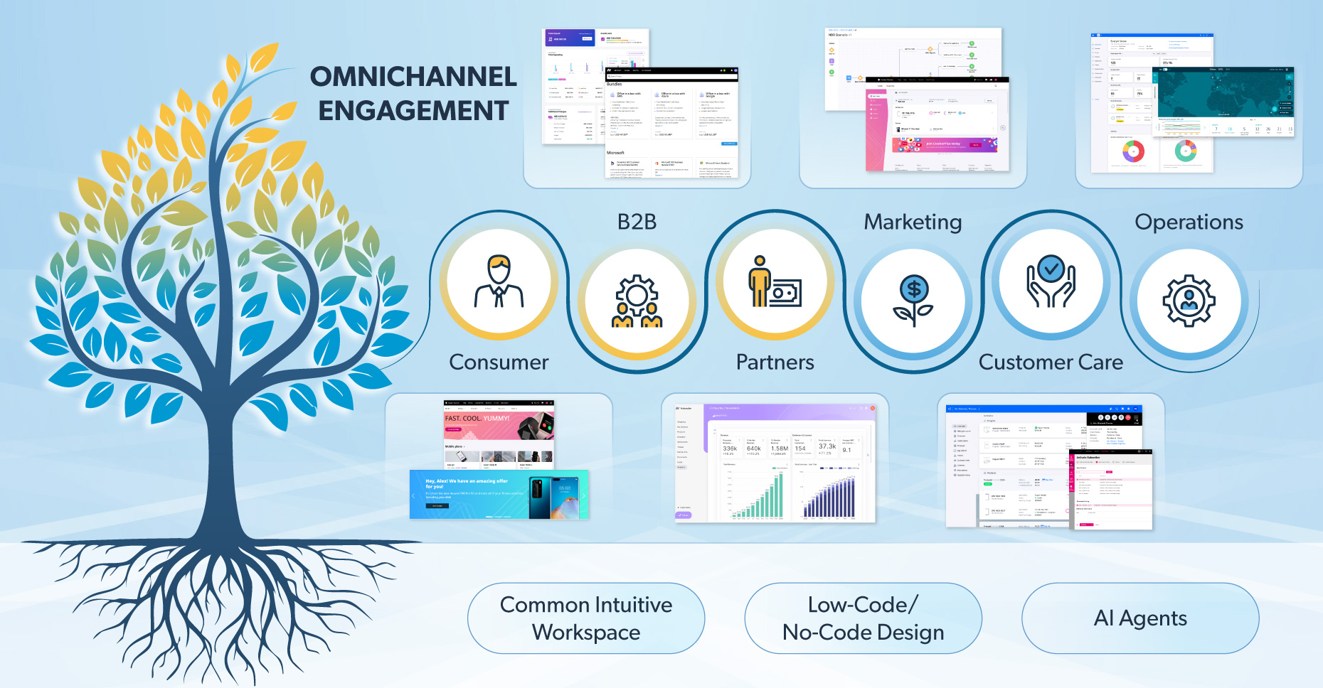 Designed with low-code/no-code tools and plug-and-play components, CSPs can create and adapt journeys in days rather than months. Out-of-the-box UI elements and a central design canvas allow instant changes across all touchpoints, with no need to rework front-end logic per channel.