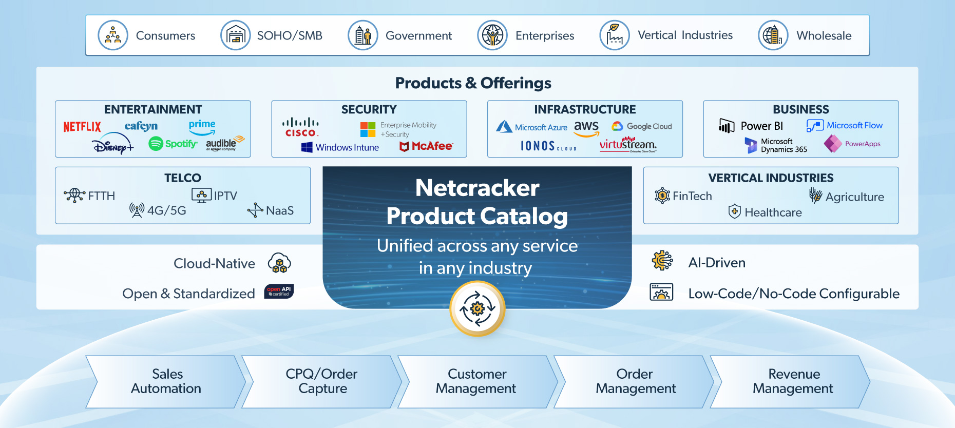 Netcracker’s unified Product Catalog dynamically adapts pricing, offers and sales flows in real time—across digital storefronts, assisted sales and partner portals—enabling CSPs to quickly monetize traditional and digital services based on customer type, behavior and business logic. Commerce becomes agile. Sales becomes smarter. Monetization becomes future-ready.