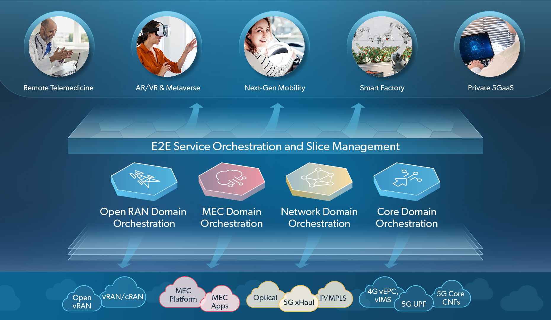 Netcracker Digital Platform includes a complete and fully integrated automation stack for the Open RAN, MEC, business edge, transport and core domains. Each Domain Orchestration solution autonomously manages the full lifecycle of services, applications and network slices by combining intent-based orchestration and dynamic modeling with real-time OSS and AIOps in a closed loop. CSPs can maintain a unified operations environment as they transition from 4G to 5G or from VNFs to CNFs and accommodate new technologies in a large partner ecosystem.