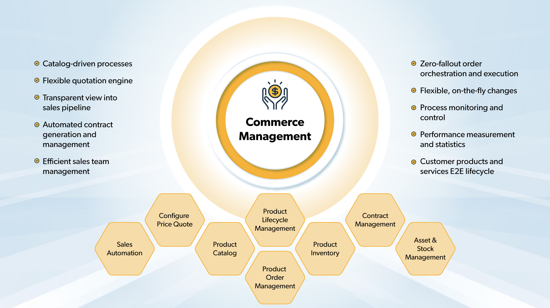 Netcracker Commerce Management is a full-scale solution covering every aspect of business operations, from introducing new services and managing the entire product lifecycle to delivering end-to-end sales automation.